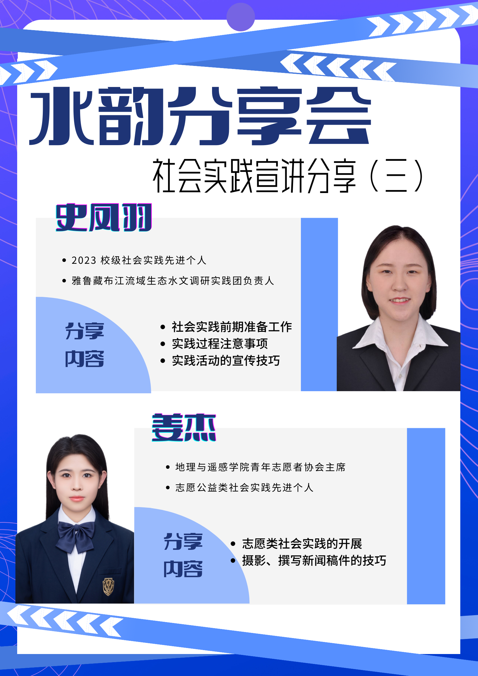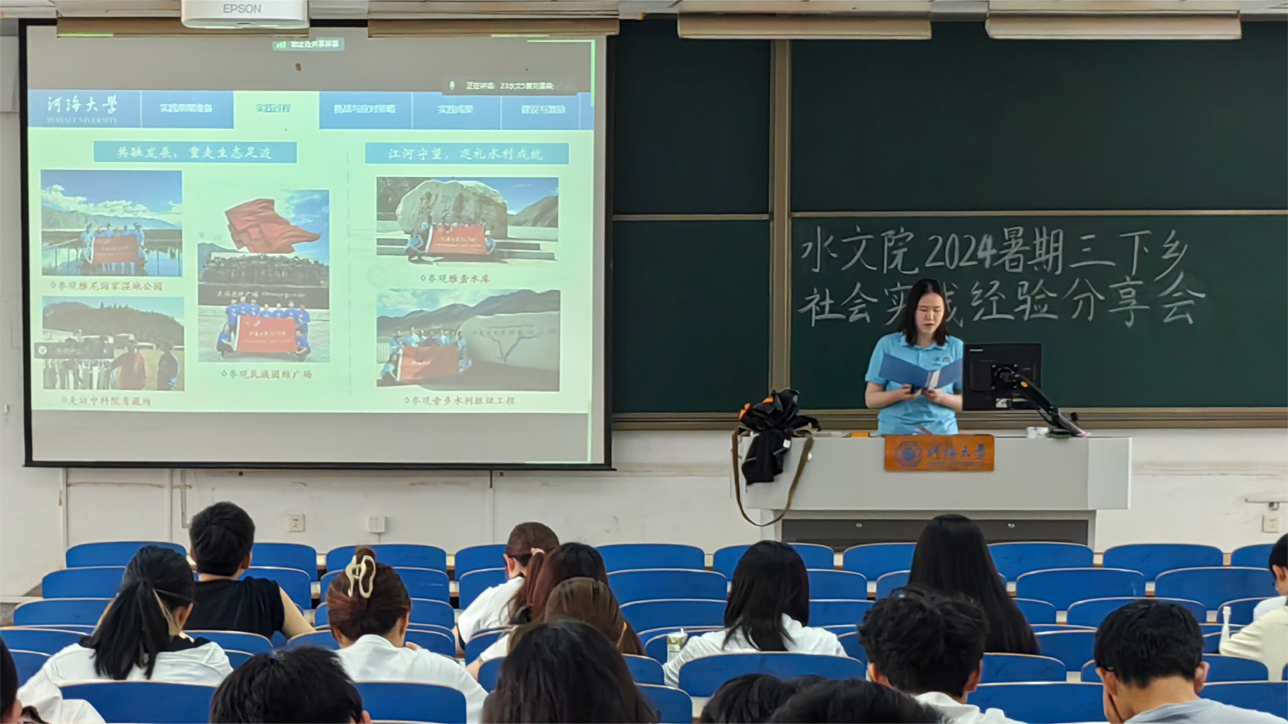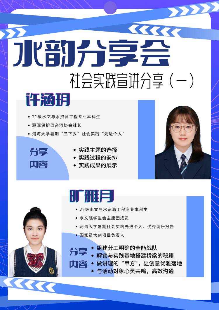 暑期社会实践系列优秀经验分享会的成功举办,不仅让参与者们分享了实践过程中的收获和感悟,也激发了更多学生对实践活动的兴趣和热情,衷心希望水文青年积极投身社会实践活动,把爱国情、强国志、报国行自觉融入新时代追梦征程,为实现中华民族伟大复兴的中国梦贡献青春力量。
