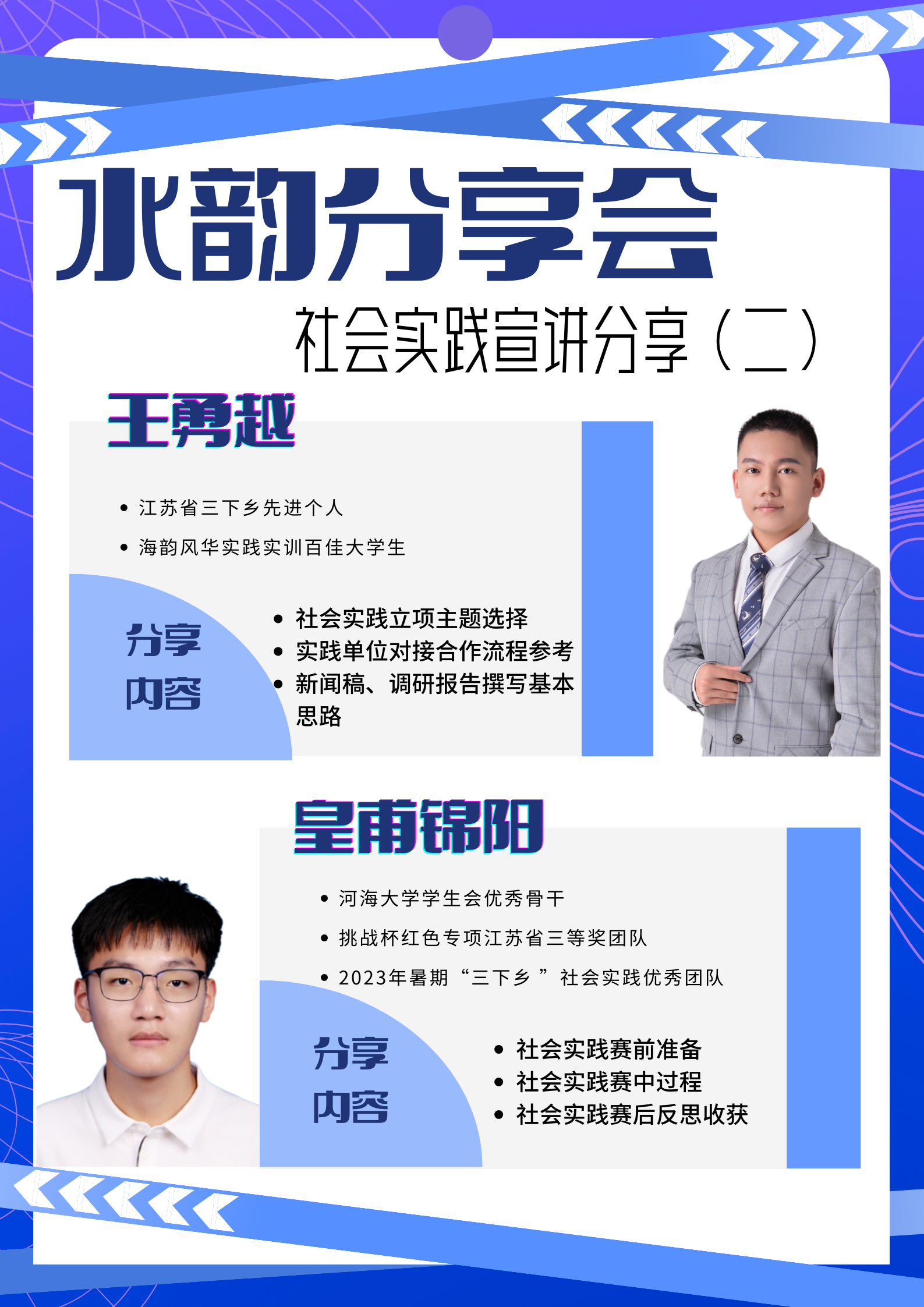 5月22日,第二场分享会邀请了2023年江苏省“三下乡”先进个人王勇越同学和“挑战杯”红色专项江苏省三等奖团队负责人皇甫锦阳同学进行了分享。