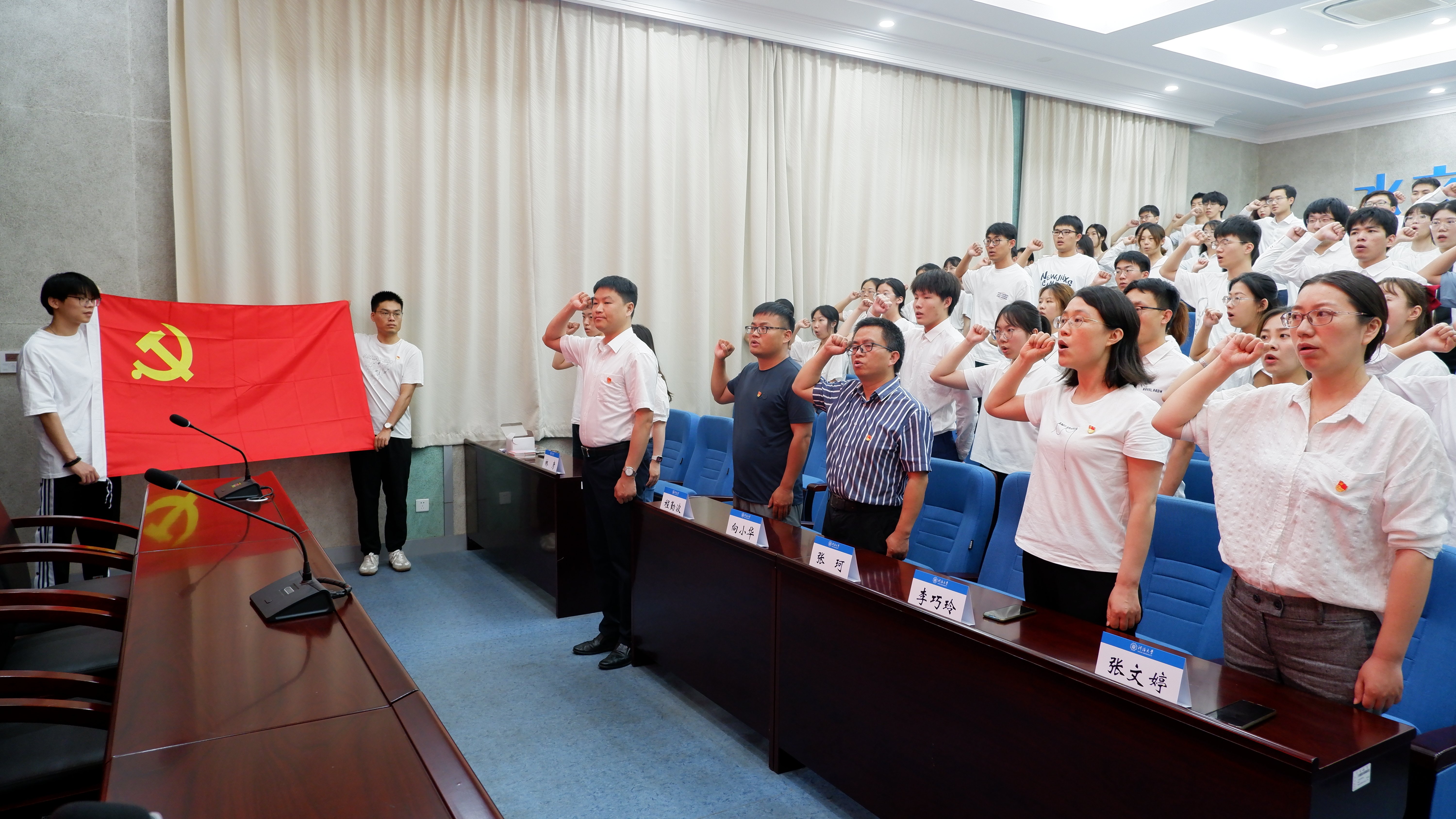 宣誓仪式上,全国样板党支部水文系第二党支部教师为新党员代表佩戴了党徽并送上《中国共产党章程》。新党员戴上党徽、高举右拳,在张珂老师领誓下,以铿锵誓言,庄严向党旗宣誓,表达坚定不移听党话、跟党走,薪火相传、接续奋斗的信念和决心。