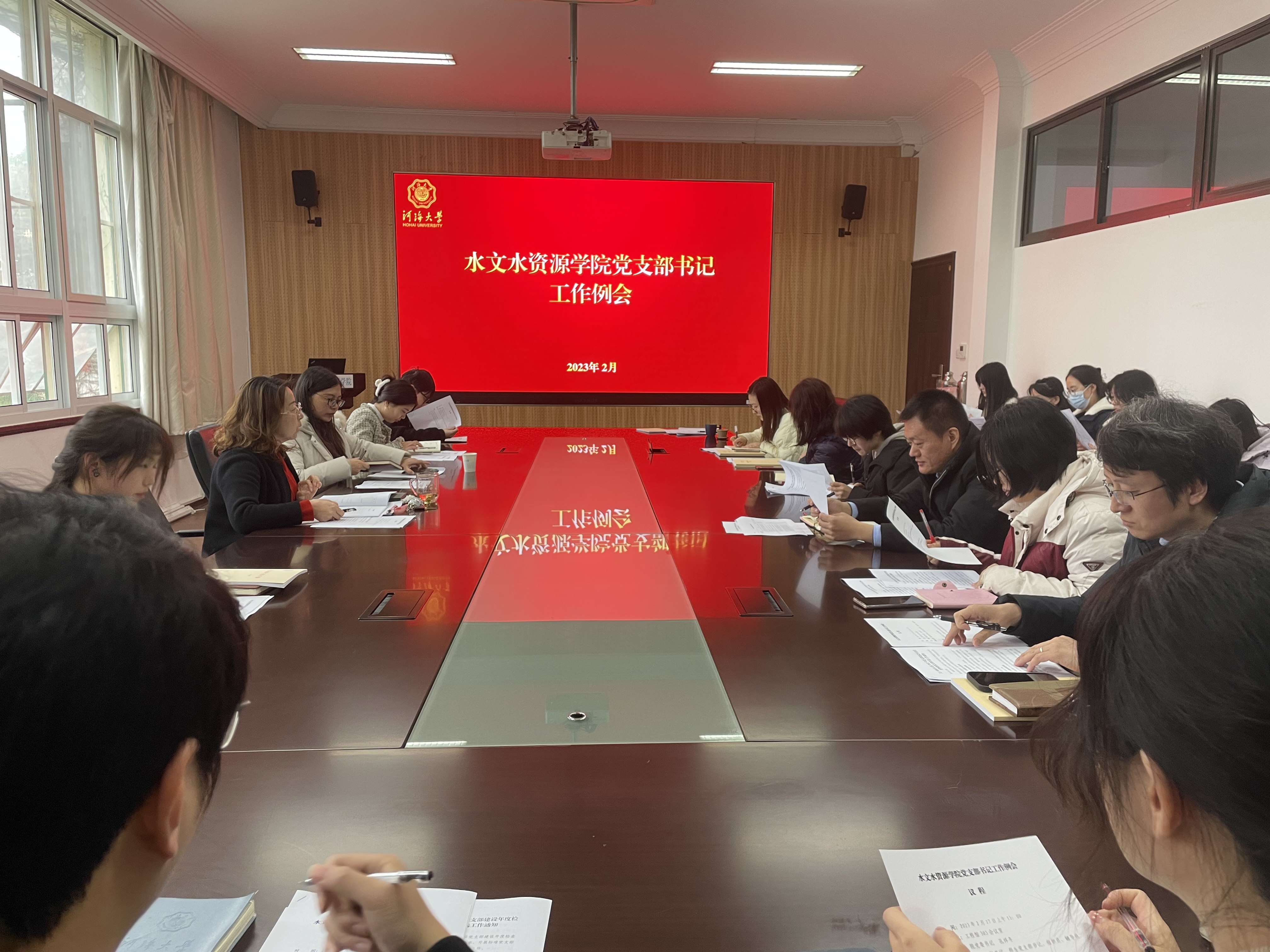 2月17日,水文院召开党支部书记工作例会。院党委书记孔祥冬、院党委副书记陈培玲、院内各师生党支部书记、组织员、辅导员等参加了会议。