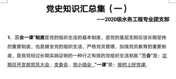 为提高团员的思想先进性和时代使命感,2021年3月29日至今,水文院2020级各团支部先后开展了党史学习主题团课,支部书记通过组织团员观看视频、阅读党史学习教材等方式,带领支部团员们学习党的百年发展史,让团员们切实感受到党员前辈们奋斗的不易,深刻体会到我国目前所取得的成就都是全党全国各族人民靠勤劳、智慧、勇气奋斗出来的。