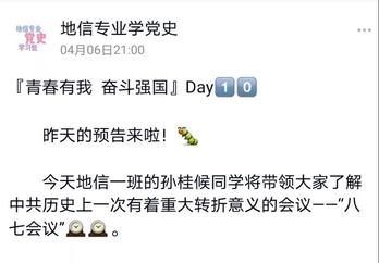 为在全年级营造党史学习的良好氛围,激发广大团员同学学习党史的积极性,2020级各支部纷纷开展“党史每日一讲”活动,通过QQ空间、QQ群等方式向各位团员同学分享百年来党的重大时刻和重要历史事件。同时,各支部还通过接力的形式,在团员间传递“讲党史”接力棒,助力团员同学们传承红色基因,厚植爱国情怀。