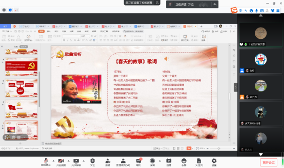 首先,丁松同志从核心意象“春”、创作背景、关键词等方面带领大家欣赏了《春天的故事》这一歌曲,回顾了中国的改革开放进程。丁松同志引用习近平总书记“历史是最好的教科书,中国革命历史是最好的营养剂。学习党史、国史,是坚持和发展中国特色社会主义、把党和国家各项事业继续推向前进的必修课”,向各位党员同志强调了学习党史的重要意义。