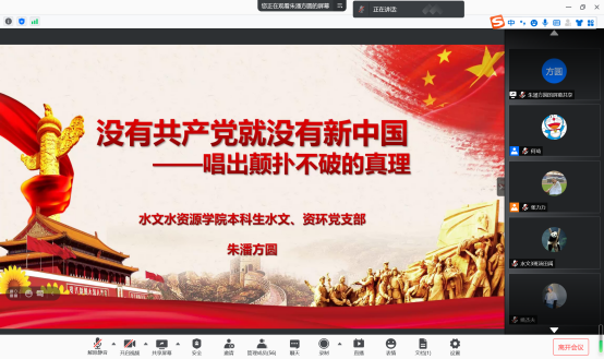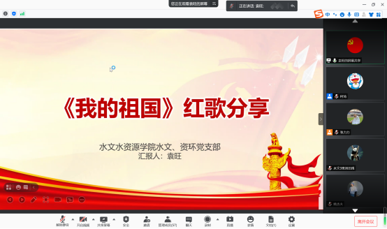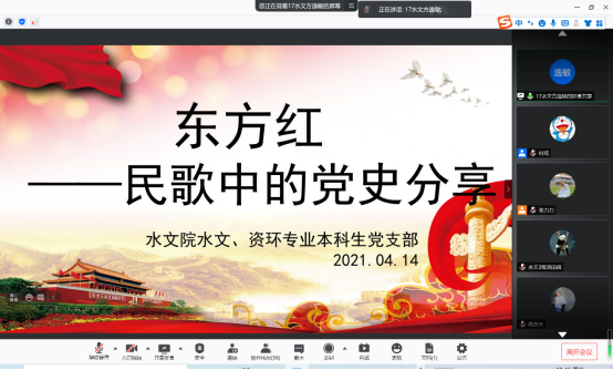 2021年4月14日晚七点半,区块链游戏 水文、资环专业本科生党支部“民歌中的党史” 音诗画分享会主题党日活动如期开展,支部书记张力力同志主持了本次分享会,支部全体党员同志参与本次主题党日活动。