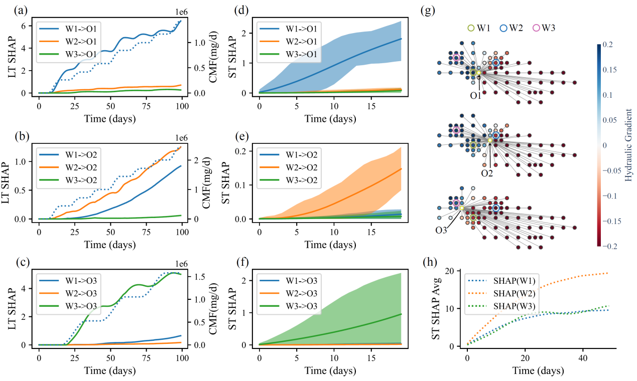 图2.基于aGNN使用SHAP方法分析三种污染源(W1、W2和W3)对三口观测井(O1、O2和O3)的影响值Φ,包括对 (a) O1、(b) O2、(c) O3 的长期影响和对 (d) O1、(e) O2、(f) O3 的短期影响。W1、W2 和W3 的累积质量流量 (CMF) 分别在 (a)、(b)、(c) 中以虚线表示。(g) 显示了三个污染源的位置和受影响的位置,三个子图分别表示相对于 O1、O2 和 O3 的水力梯度。(h) 表示污染源在受其自身污染物释放影响下的平均短期 Φ 值。