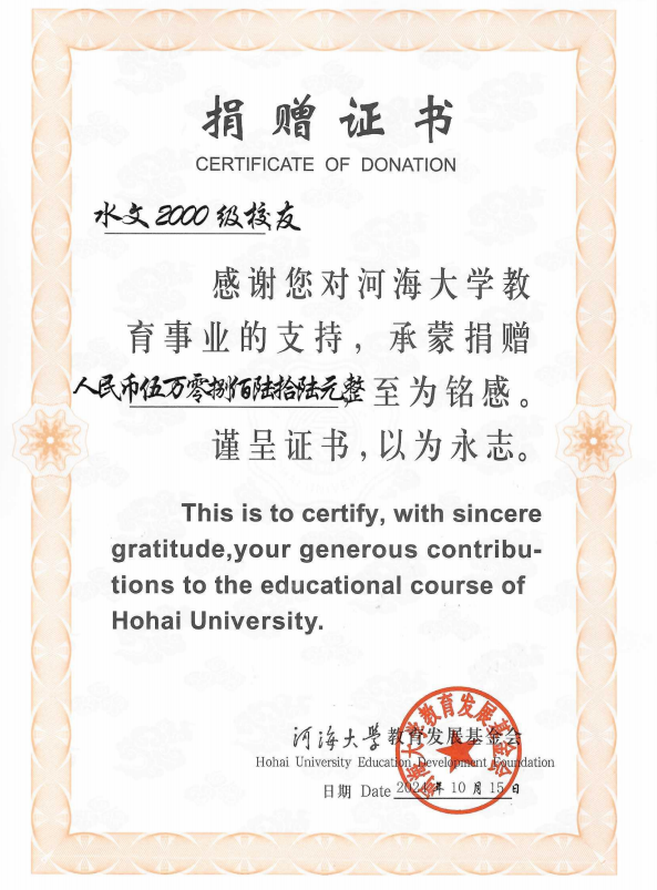 饮河海一滴水,献河海一生情。返校期间,水文2000级校友了解到刘光文水文科技教育基金情况,短短几天向基金捐款60866元,为纪念以刘光文教授为代表的水文学科老一辈开拓者,践行新时代水利精神,持续为水利高质量发展贡献力量!