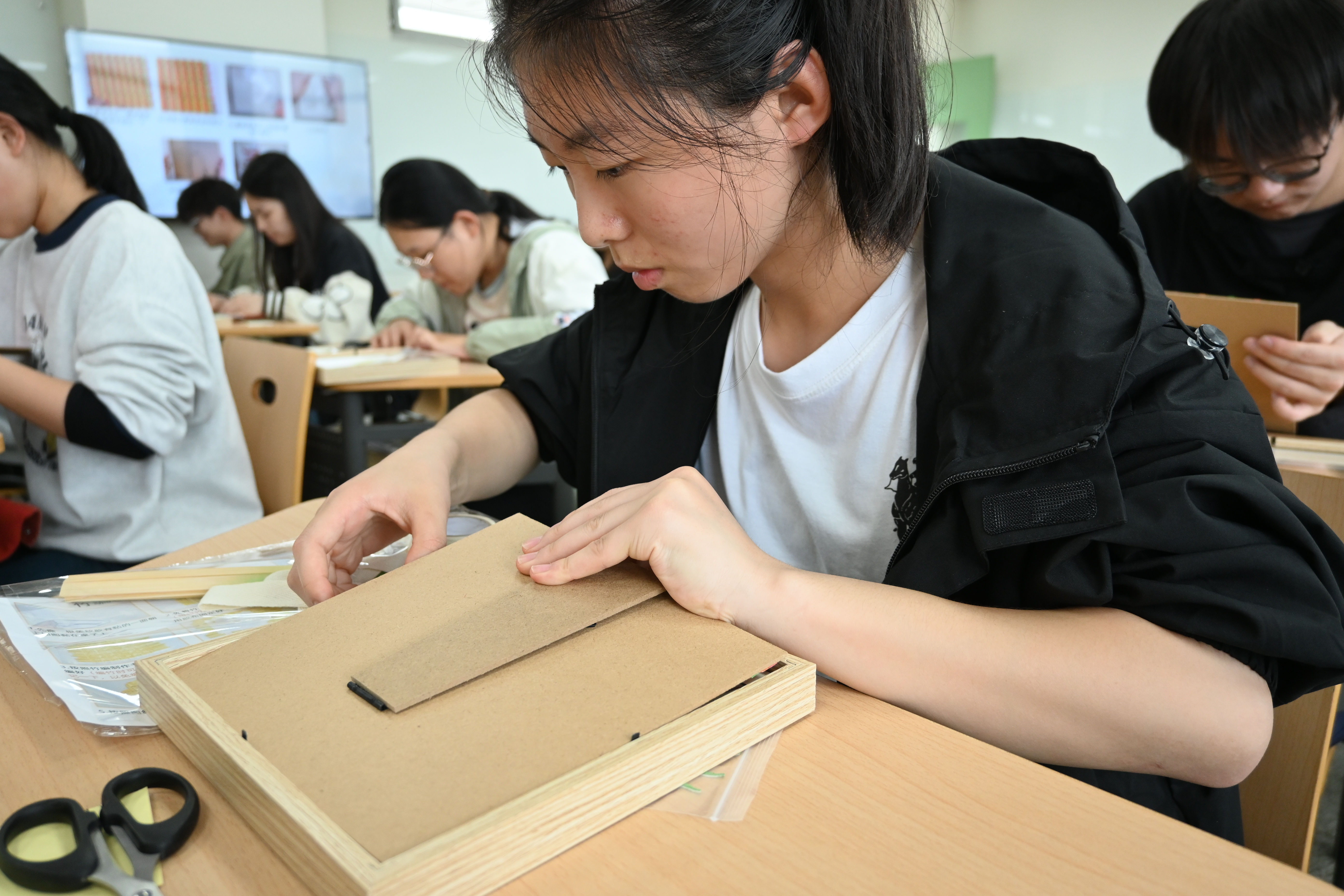 辅导员吴晓芬老师简要介绍了竹编的发展历史、制作流程及传承意义,说明了竹编过程中的注意事项,并呼吁同学们以制作竹编作品为契机表达对祖国繁荣富强的美好祝福。制作的过程中,同学们在老师的指导下以手造物,以物寄情,通过一上一下,一横一竖的编织方法,在挑、压、破、拼、提等手工编织技法下,将心中图景编织成了一幅幅饱含爱国爱党情怀的竹编画作品和一个个充满深厚文化底蕴的竹编扇作品。