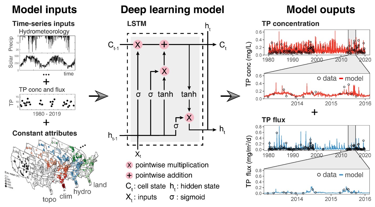 该研究是在前期工作基础上(文末相关成果),运用了气象水文和流域大数据以及多任务深度学习模型(图2),突破了总磷数据稀缺、分辨率不足的限制,实现了国家尺度上对总磷浓度和通量的逐日、长时序模拟;研究揭示了不同类型河流总磷的长期演变趋势和季节性变化,为评估污染治理效果和优化流域管理提供了更全面的视角。此外,通过模型可解释方法,揭示了气候变化导致的径流增加,是驱动了总磷通量持续上升的主要因素,凸显了气候变化对面源污染的放大效应,以及加强流域面源治理的紧迫性和重要性。
