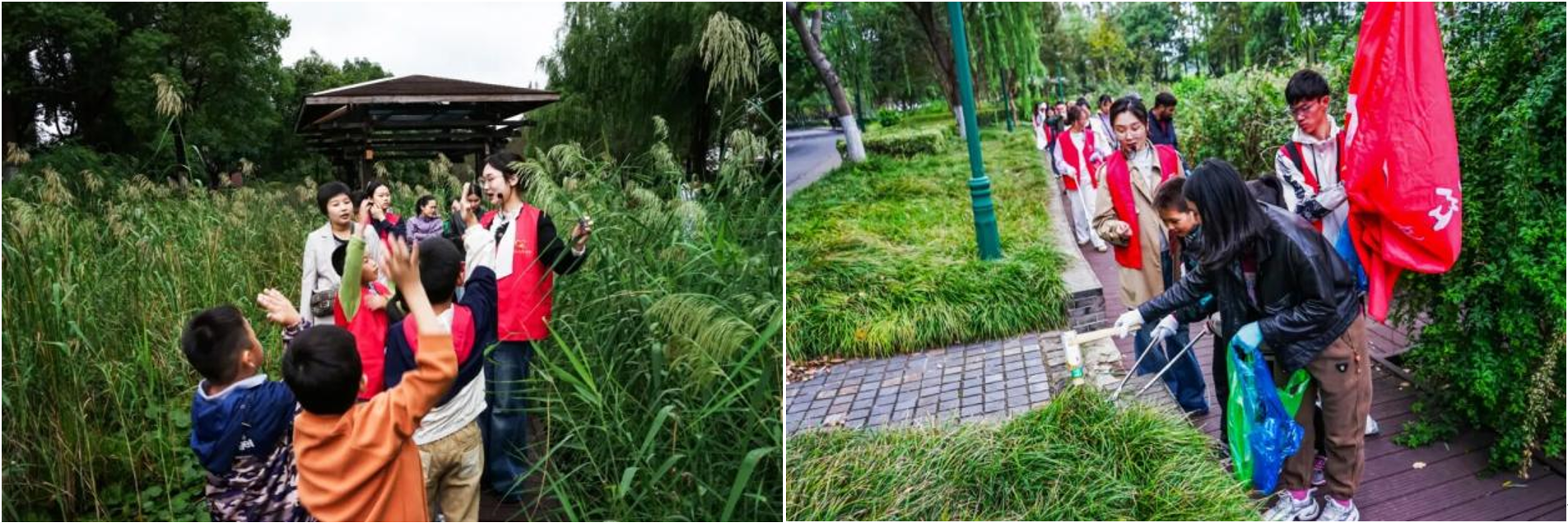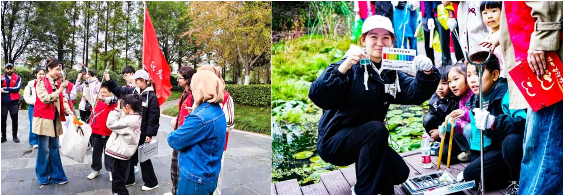护河行动正式展开后,志愿者与青少年分为垃圾清理、水质检测、植被观察3个小组,分工协作推进服务。垃圾清理组的孩子们手持垃圾夹、垃圾袋,弯腰穿梭在河岸步道与草丛间,仔细捡拾塑料瓶、烟头等杂物;遇到卡在石缝里的垃圾,便蹲下身子用手小心抠出,随后在水文院学子指导下,规范完成可回收物与其他垃圾的分类投放,动作认真且熟练。水质检测组由8名水文院青年志愿者组成,他们沿着河道科学选取监测点,小心翼翼地操作检测仪器,待数据稳定后,孩子们兴奋地记录下“pH 值 7.2,河水清澈,数据正常”的结果,感受水质监测的专业魅力。植被观察组中,水文院学子耐心为围拢的孩子讲解岸边植物的生长特性与水土保持作用,还带领大家一起观察树木生长状态,引导青少年关注河道周边植被生态。