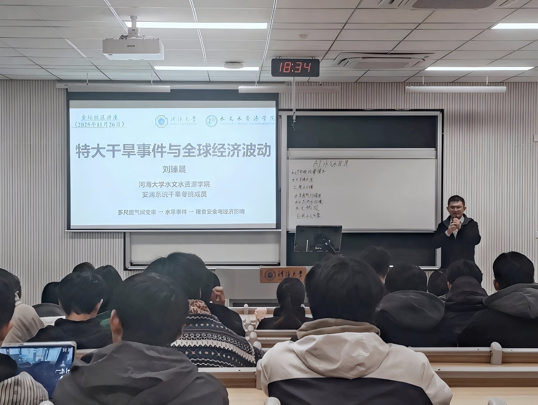 刘臻晨老师从水文气象学与人工智能水文学的交叉视角,从灾害影响、水旱机理、监测预测等层面为同学们系统梳理了特大干旱的成因、影响与当前研究进展,指出人工智能正推动水旱灾害研究的范式重构与能级跃升,为应对极端干旱提供了全新路径。此外,刘臻晨老师还结合人工智能通识导论课为同学们介绍了人工智能技术在水文学科不同研究方向的广泛应用,并勉励在场同学明确学习目标,不断提升专业能力,将“水利+AI”的智慧实践书写在祖国江河湖海的宏伟蓝图中。