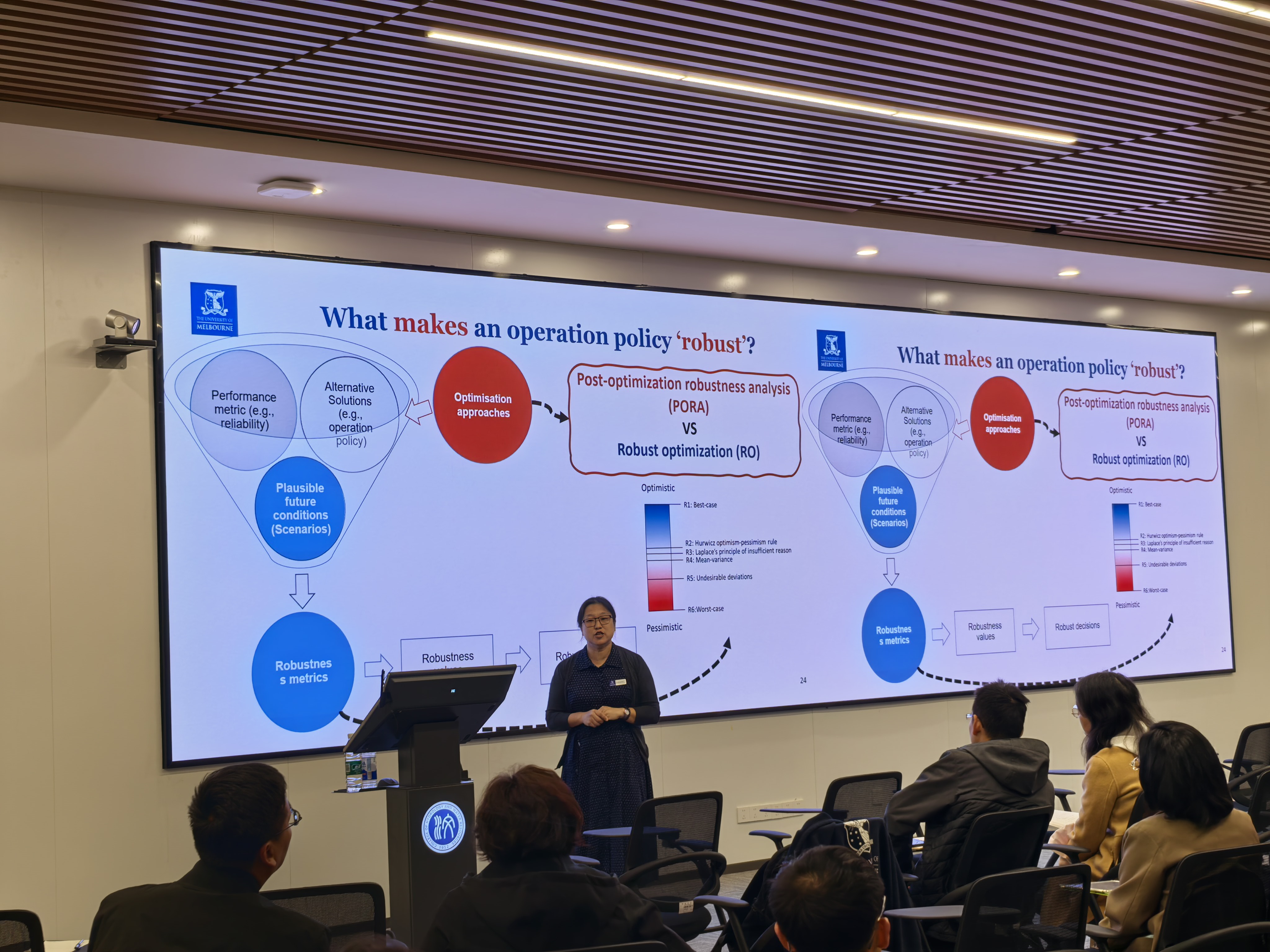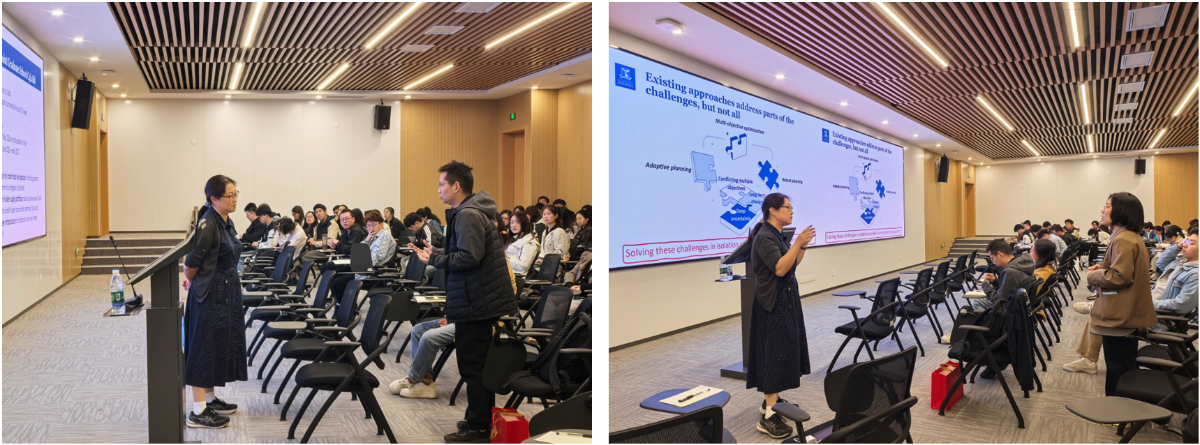 结合澳大利亚和意大利的典型案例,Wenyan Wu教授深入分析了折现率、初始基础设施能力及系统边界定义等建模假设对最优规划结果的显著影响,强调忽视经济、结构与概念层面的非气候不确定性可能产生虚假的安全感,或将导致系统处于低效运行路径中。报告内容前沿性强、理论与实践结合紧密,现场师生就模型构建、适应性管理路径等问题与Wu教授进行了交流探讨。